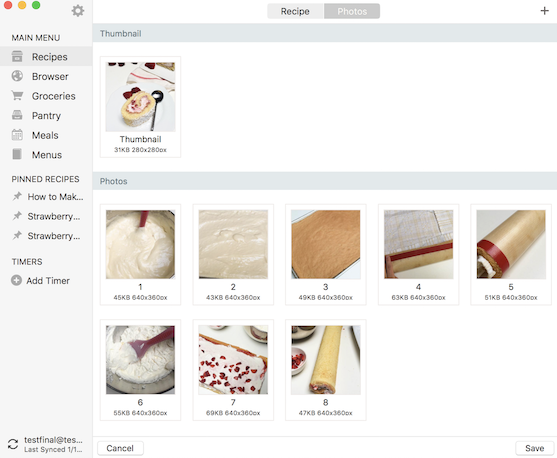 From the edit recipe view, click the Photos section to see all photos associated with a recipe. To add a photo from the filesystem, click the + button on the right side of the upper toolbar. You can also right-click on the edit photos screen and choose Add Photo. Photos can be dragged in from other apps, or copied to the clipboard. Once copied to the clipboard, right-click on the edit photos screen and choose Paste Photo.